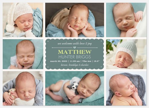 Celebrate your newest family member with this charming multi-photo birth announcement that beautifully showcases eight precious moments. The mosaic-style photo grid surrounds an elegant scalloped label in soft sage green, featuring graceful script typography and delicate heart accents. This thoughtful layout allows you to share multiple sweet snapshots while announcing your baby's arrival to loved ones.