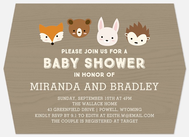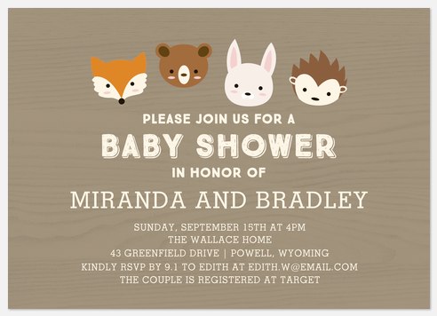 Celebrate your upcoming bundle of joy with this charming woodland-themed baby shower invitation featuring four adorable kawaii-style forest creatures. The sweet fox, bear, bunny, and hedgehog faces are beautifully displayed against a warm beige wood grain background with clean white block lettering. This delightful design creates the perfect welcoming atmosphere for gathering loved ones to celebrate your new arrival. Customize all text fields with your party details on quality cardstock.