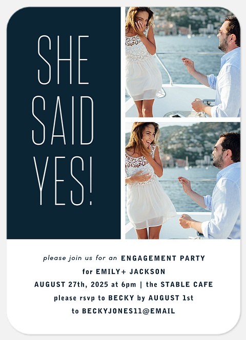 Celebrate your engagement with this bold and modern engagement party invitation that perfectly captures the excitement of saying "yes." The striking design features a navy blue panel with oversized white typography alongside a clean two-photo grid layout that showcases your special moments. This eye-catching invitation creates the perfect way to gather your loved ones and share in the joy of your engagement celebration.