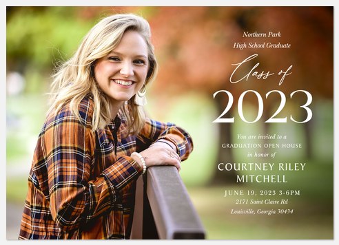 Celebrate your graduate's milestone achievement with this stunning full-photo graduation card that puts their accomplishment front and center. The design features an elegant script 'Class of' paired with bold serif numerals for the graduation year, all beautifully overlaid on your chosen photo with a warm gradient effect. This sophisticated layout perfectly balances personal photography with essential event details, creating a memorable keepsake that captures this proud moment.