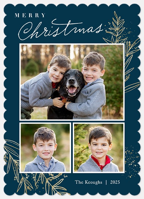 Share your family's holiday joy with this stunning Christmas greeting card featuring an elegant three-photo layout. The rich teal background showcases mixed typography with "MERRY Christmas" in serif and script lettering, beautifully complemented by shimmering gold foil botanical illustrations of frosted branches, berries, and decorative dots. This sophisticated design perfectly balances your cherished family photos with festive elegance, creating a memorable way to send warm holiday wishes.