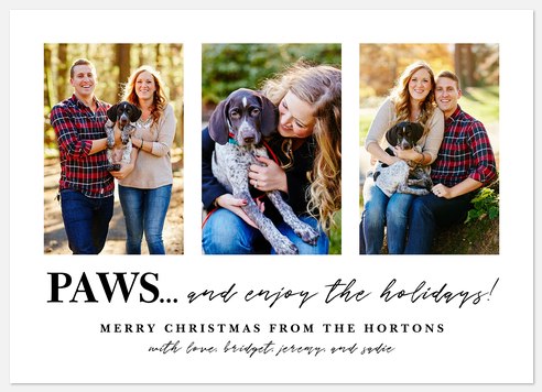 Celebrate the holidays with your furry family members using this charming winter holiday greeting card featuring a clever "paws" and pause wordplay. The design showcases a sophisticated three-photo layout with bold serif typography for "PAWS" paired with elegant script lettering for the holiday message. Perfect for pet-loving families who want to include their beloved dogs or cats in their seasonal greetings with a touch of humor and warmth.