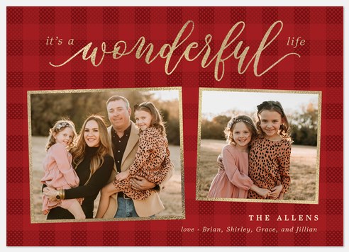 Celebrate the season with family warmth using this stunning holiday greeting card featuring rich burgundy plaid and luxurious gold foil calligraphy. The design showcases elegant hand-lettered script declaring "it's a wonderful life" above two beautifully framed photo spaces for your cherished family memories. This timeless layout perfectly captures the joy and togetherness that make the holidays truly special. Personalize with your photos and family details for a meaningful keepsake card.