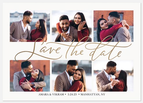 Announce your upcoming wedding with this stunning save the date card featuring a sophisticated six-photo collage layout. The design showcases elegant golden script lettering with decorative flourishes that gracefully overlays your cherished engagement photos. This multi-photo format allows you to share multiple special moments while giving guests all the essential wedding details.